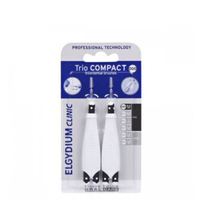 Elgydium Clinic Trio Compact Escovilhões interdentários espaços muito estreitos elimina eficazmente a placa bacteriana. É constituido por cerdas bicolores sendo que a parte brancas serve para revelar as gengivas sensíveis em caso de zonas sagramento e a parte preta, mais finas, para facilitar a inserção de escova e visualizar a eliminação da placa bacteriana.