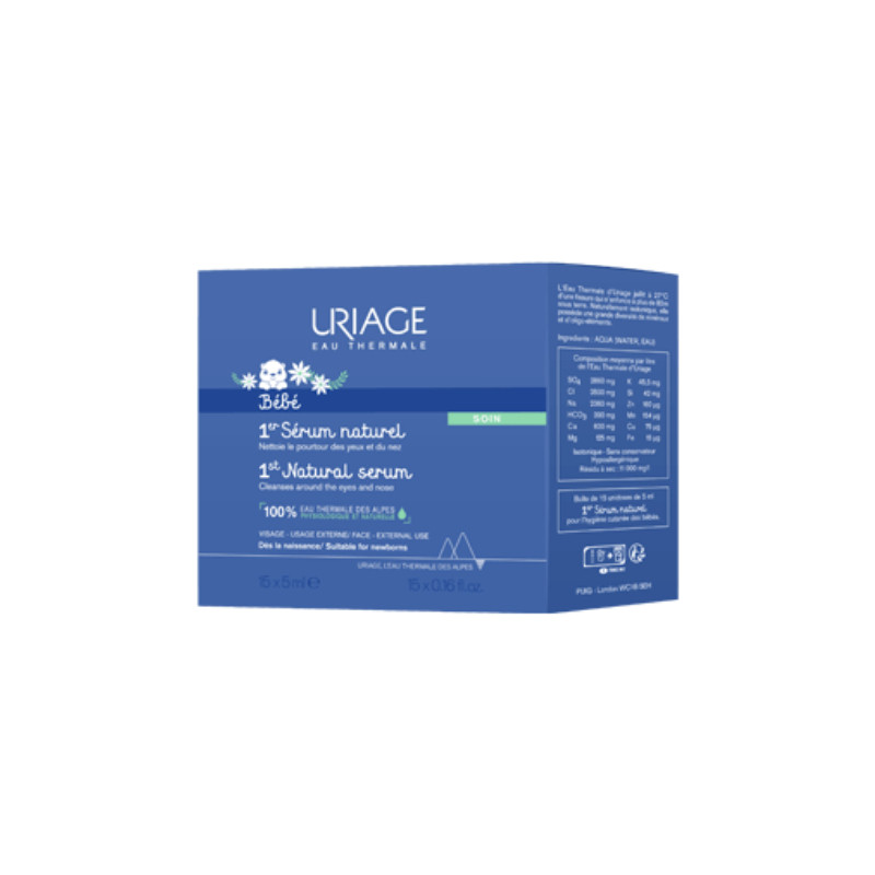 Uriage Bebé 1º Soro Fisiológico Natural é um soro fisiológico 100% natural especialmente formulado para a limpeza suave dos olhos e nariz de bebés e crianças. A sua fórmula contém propriedades calmantes e suavizantes graças à sua concentração em minerais e oligoelementos. Sem fragância, testado sob controlo dermatológico e pediátrico. Graças à isotonicidade da Água Termal de Uriage, limpa suavemente o contorno dos olhos e do nariz sem ressecar ou irritar. Não guardar após a abertura devido ao risco de contaminação. Uso externo. Quantidade: 15 unidades de 5 ml cada uma.
