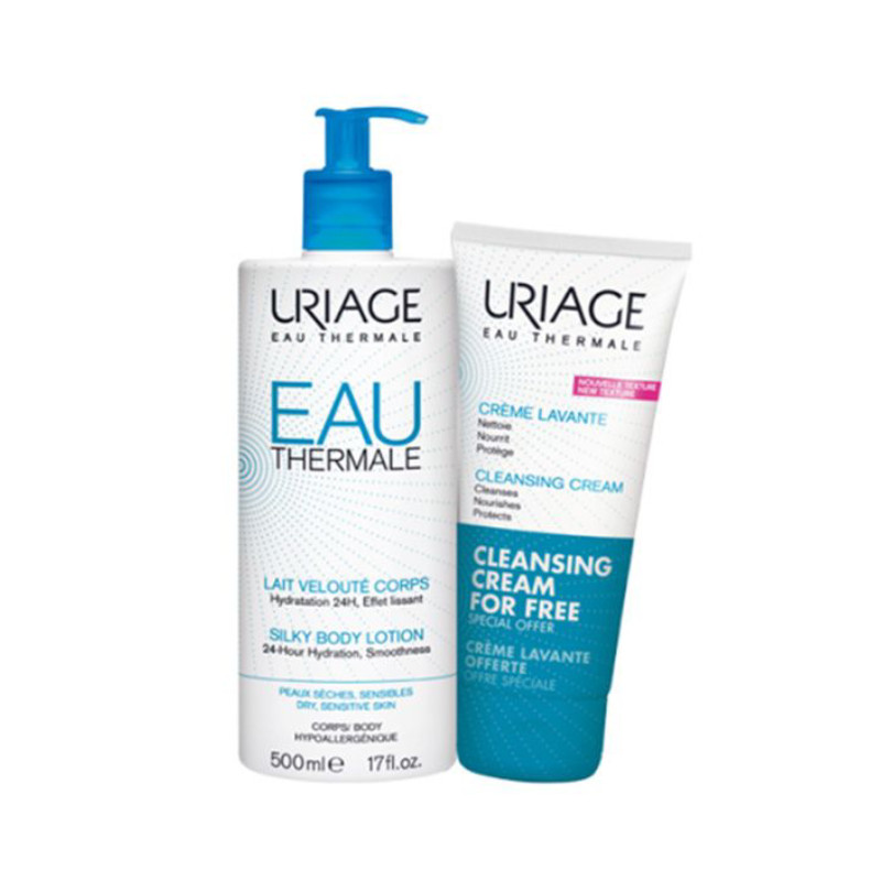 Uriage Leite Aveludado de Corpo Oferta Creme Lavante é um pack composto por 2 cuidados: Uriage Leite Aveludado de Corpo (500ml) e Uriage Creme Lavante (250ml). Uriage Leite Aveludado de Corpo é um cuidado de higiene de corpo, indicado para pele seca. Promove uma hidratação intensa otimizada e um conforto cutâneo com efeito de longa duração de 24h. Apresenta uma textura suave e muito agradável, hidrata a pele seca e permite vestir de imediato. Uriage Creme Lavante é um cuidado de limpeza, indicado para pele normal a seca. Adequado para rosto, corpo e cabelo. Elimina suavemente todas as impurezas. A sua fórmula contém óleo-nutritivo [Manteiga de Karité + Óleo de Limnanthes Alba + Óleo de Girassol], que preserva o filme hidrolipídico e deixa a pele hidratada, suave e macia. Possui propriedades hidratantes e protetoras da Água Termal de Uriage, preserva o filme hidrolipídico da pele.