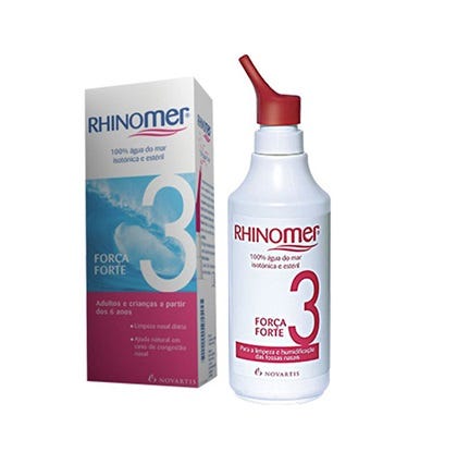 Rhinomer Spray Nasal Força 3 é 100% água do mar não diluída. Está indicado para limpeza nasal diária e ajuda natural em caso de congestão. Manter as fossas nasais limpas e em boas condições através de lavagens nasais regulares com água do mar ajuda ao seu bom funcionamento, e a prevenir irritações nasais. Rhinomer apresenta um teor em cloreto de sódio diminuído para ser compatível com a mucosa nasal mas conserva todos os minerais e oligoelementos da água do mar assegurando uma limpeza correta das vias nasais.